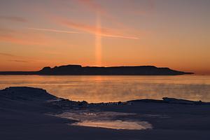 A Light Pilar Crosses A Jet Trail At Sunrise