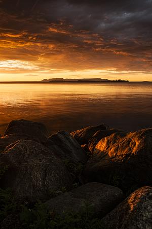A Sky On Fire And A Rocky Shoreline