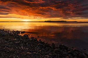 A vivid red sky over The Sleeping Giant at sunrise
