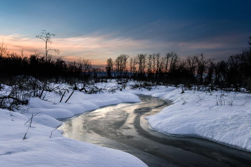 A Nearly Frozen Creek Flows At Sunset Near Thunder Bay