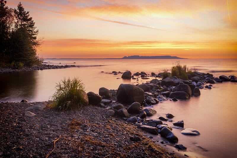 Sunrise produces an orange glow over The Sleeping Giant in Thunder Bay, Ontario